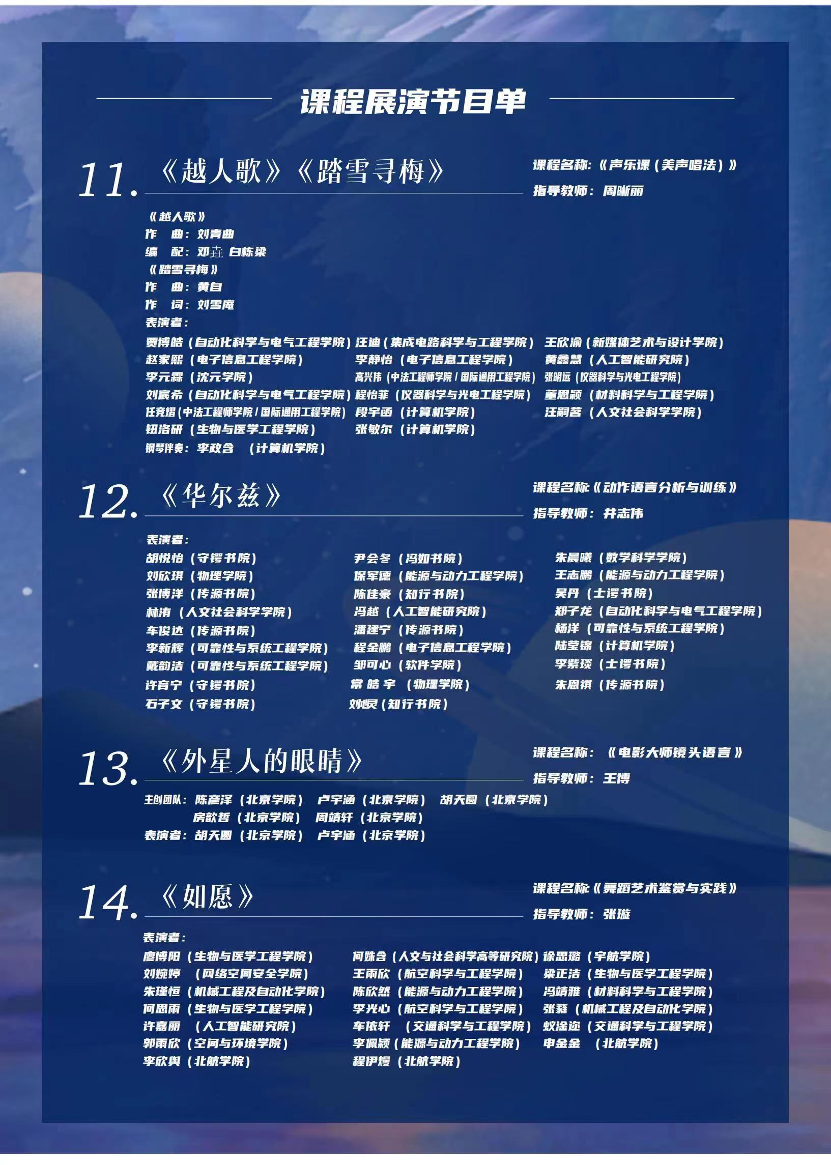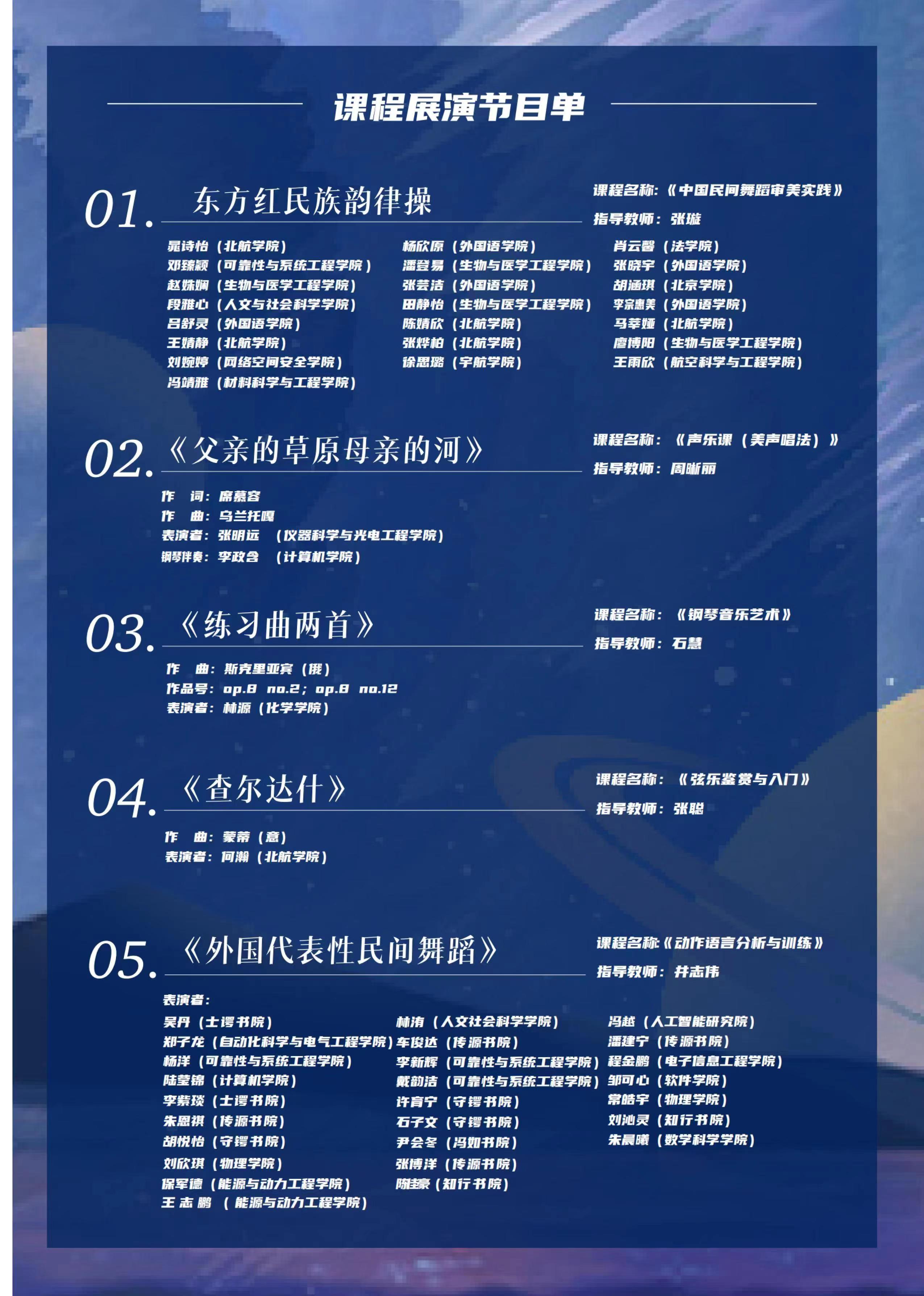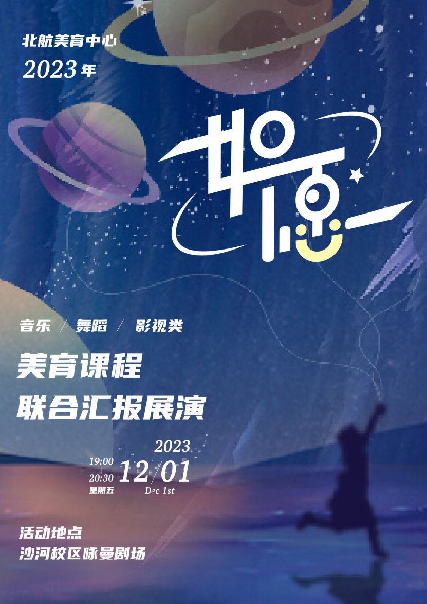 北航美育中心2023年音乐、舞蹈、影视美育课程联合汇报展演的主题为《如愿》,此次课程展演涉及美育中心8名教师的13门课程,参与学生表演人数为91人,在展示美育课堂的同时,体现立德树人的核心思想。意在通过艺术浸润的方式,让北航莘莘学子铭记“航空救国”的历史,致敬老一辈航空航天事业的建设者们,传承其艰苦朴素、勤奋好学、全面发展、勇于创新的美好精神,践行“德才兼备,知行合一”的校训,擦亮北航人“空天报国”的精神底色,愿北航的青年人不负先驱们所愿,努力奋斗,砥砺前行,佑祖国山河无恙,烟火寻常,如其所愿。