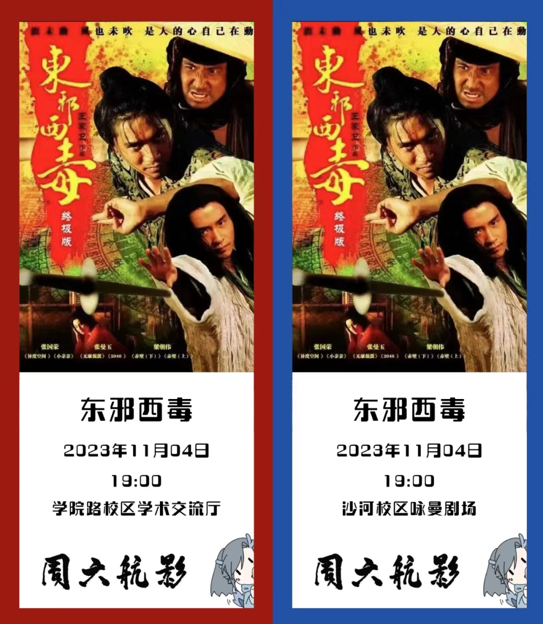 11月4日(周六)19:00,《东邪西毒》将于学院路校区学术交流厅和沙河校区咏曼剧场同步放映!