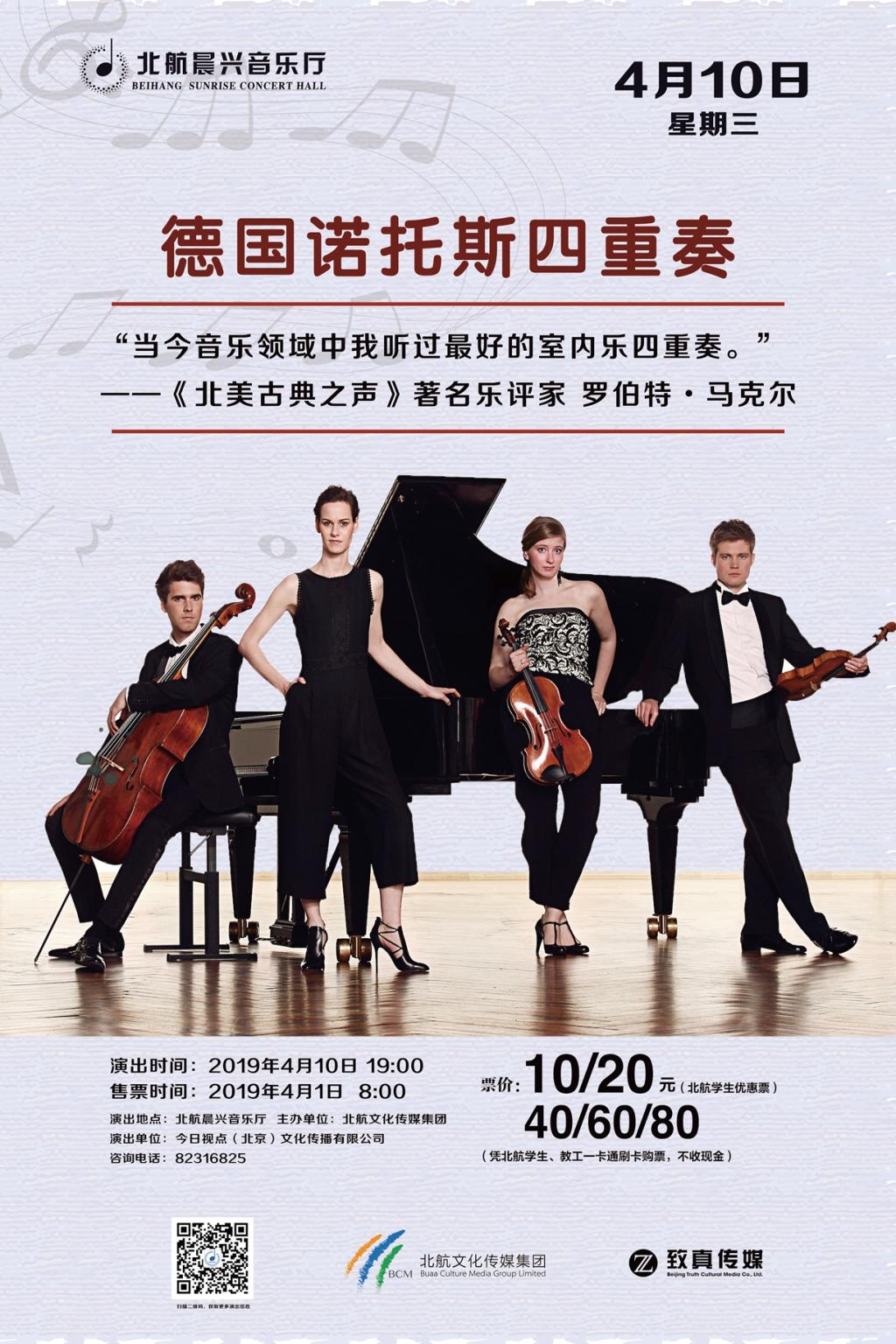 德国诺托斯四重奏被誉为当今最杰出的室内乐四重奏(德国音乐期刊Fono Forum)。他们精湛的音乐才华,完美的演奏技巧以及完美平衡演奏出古典乐曲中的每个细节,深深的从心灵深处打动全球乐评家以及古典乐迷。团队成员主要有:信德里·雷德勒—小提琴、安德利亚·伯尔格—中提琴、菲利普·格莱姆—大提琴、安东尼娅·古斯特—钢琴。诺托斯四重奏自2007年成立以来,获得了众多国际比赛的首奖,其中包含了中国勋菲尔德国际弦乐赛,艾尔米国际室内乐大赛,荷兰查尔斯荷楠克尔克斯国际室内乐大赛,意大利佛罗伦萨维托里奥·古依大赛以及英国伦敦帕克豪斯大赛等。